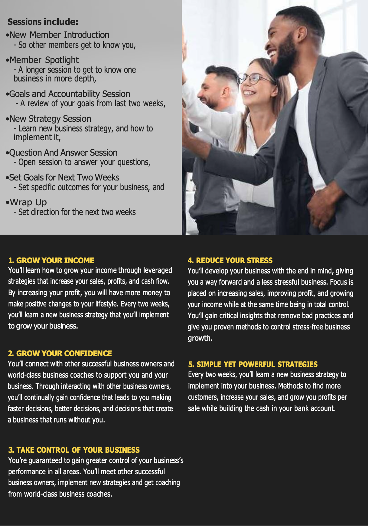 This is a coach-led program for business owners and professionals to boost profits through bi-weekly breakfast meetings (15-25 members per club, up to four clubs) focused on education, peer coaching, and networking, plus monthly two-hour workshops.